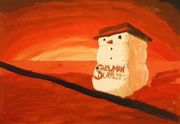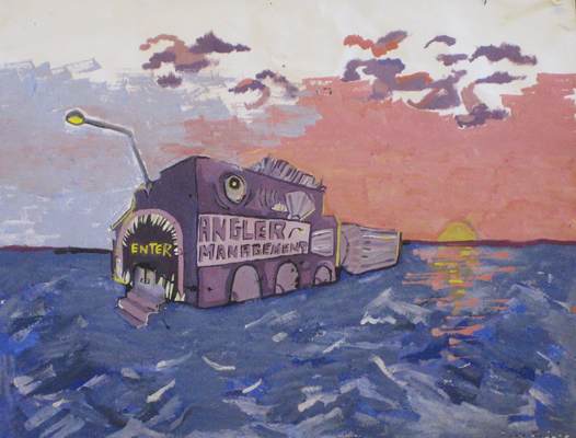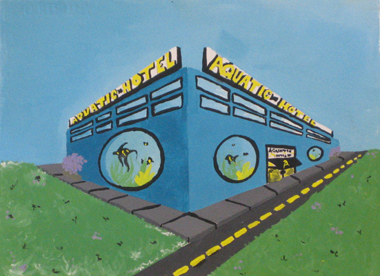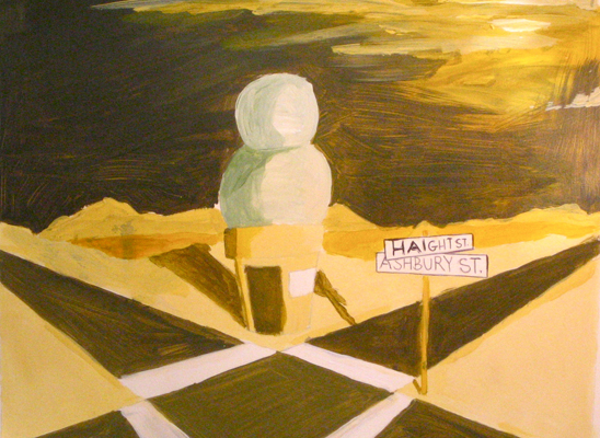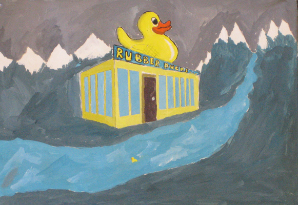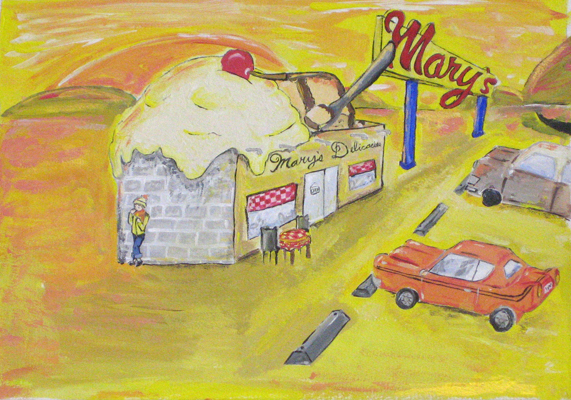 After exploring the landscapes of Ed Ruscha, and the mid-century phenomenon of vernacular architecture, beginning students made a 2-point perscpective vernacular building with a limited color palette in acrylic or tempera paint. |