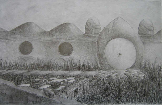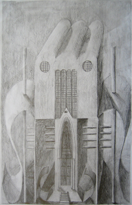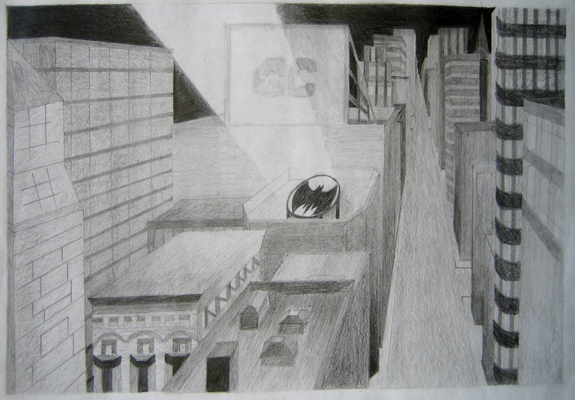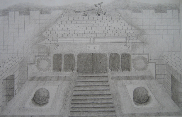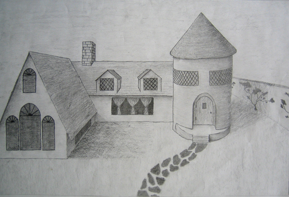 After several exercises in 2-point perspective, students drew from various architectural styles to create a fantasy architectural scene. After working out the perspective in a detailed sketch, students then rendered their scene with graphite