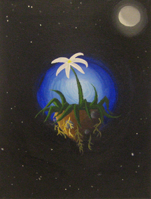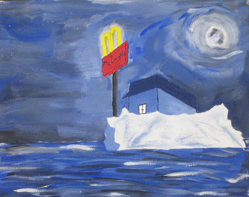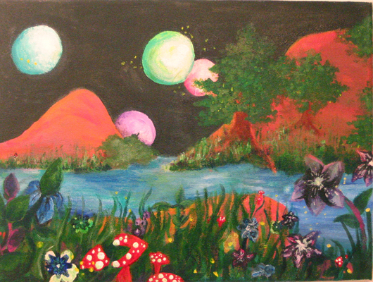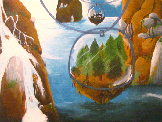 After several acrylic landscape painting exercises, intermediate-level students created their own past or future landscape using techniques such as 2-point perspective. |
